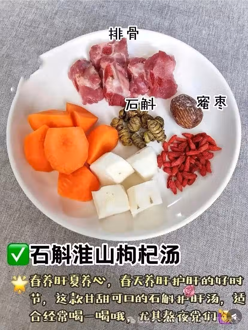 做法:石斛提前泡2小時;淮山、胡蘿蔔削皮切塊;排骨焯水後, 加石斛煮30分鐘, 再加准山胡蘿蔔蜜棗煮30分鐘, 起鍋前5分鐘加入枸杞、鹽調味