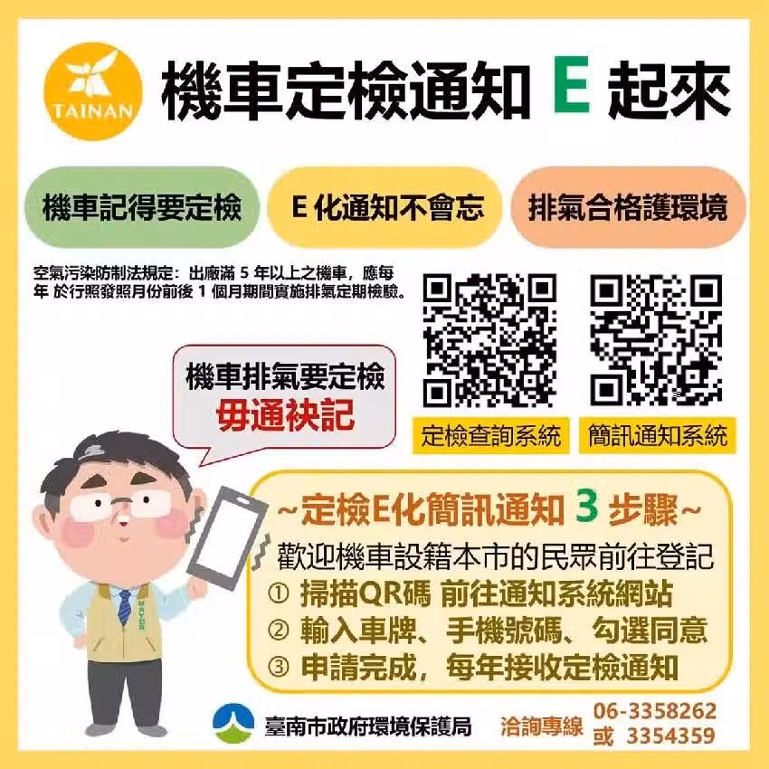 台南市環保局表示,自2020年起推動機車定檢簡訊通知系統,已收集約34萬筆機車參與簡訊資料。