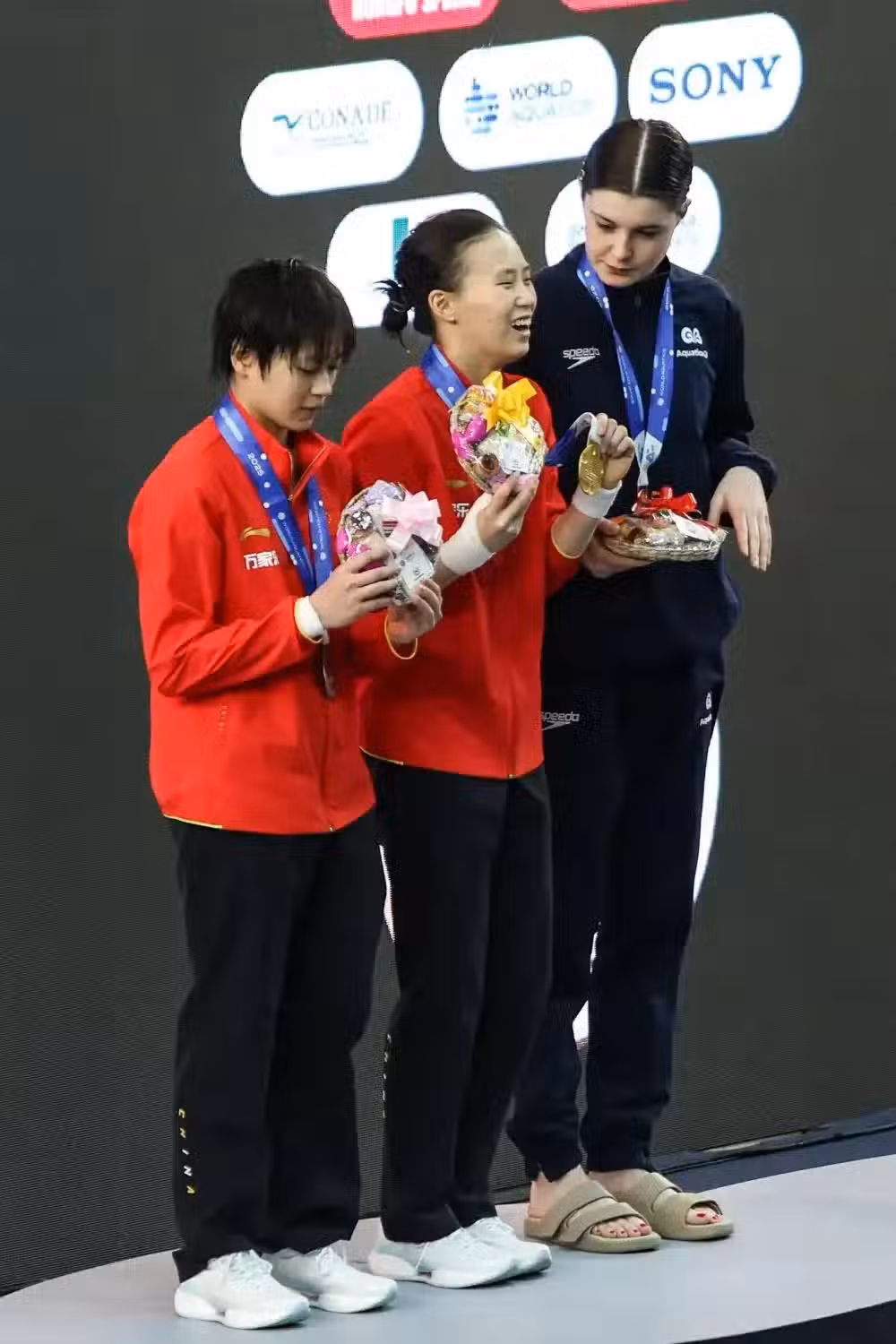 4月5日,陳芋汐(中)、全紅嬋(左)在2025年世界泳聯跳水世界盃瓜達拉哈拉站女子10米台頒獎儀式上。新華社發(迪亞娜·馬克斯攝)