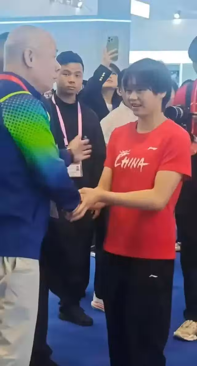 4月23日的活動現場,上演了溫馨且萌趣的一幕。水花終結者與中國體操界的傳奇人物驚喜同框。儘管二人年齡相差數十載,卻相談甚歡,氛圍格外融洽。