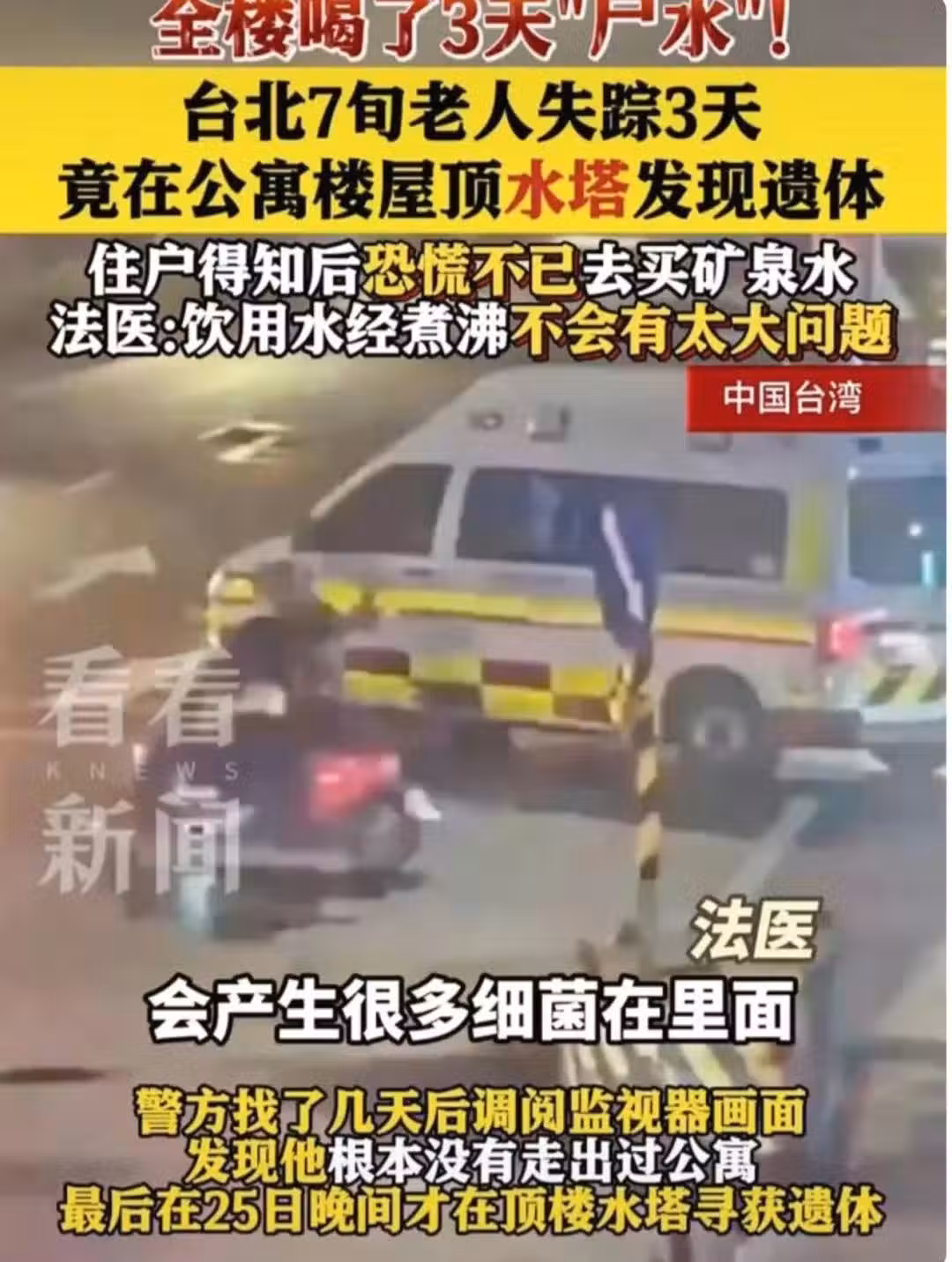 太驚悚!七旬老人泡在樓頂水塔,全樓喝3天「屍水」,法醫:煮沸喝問題不大
