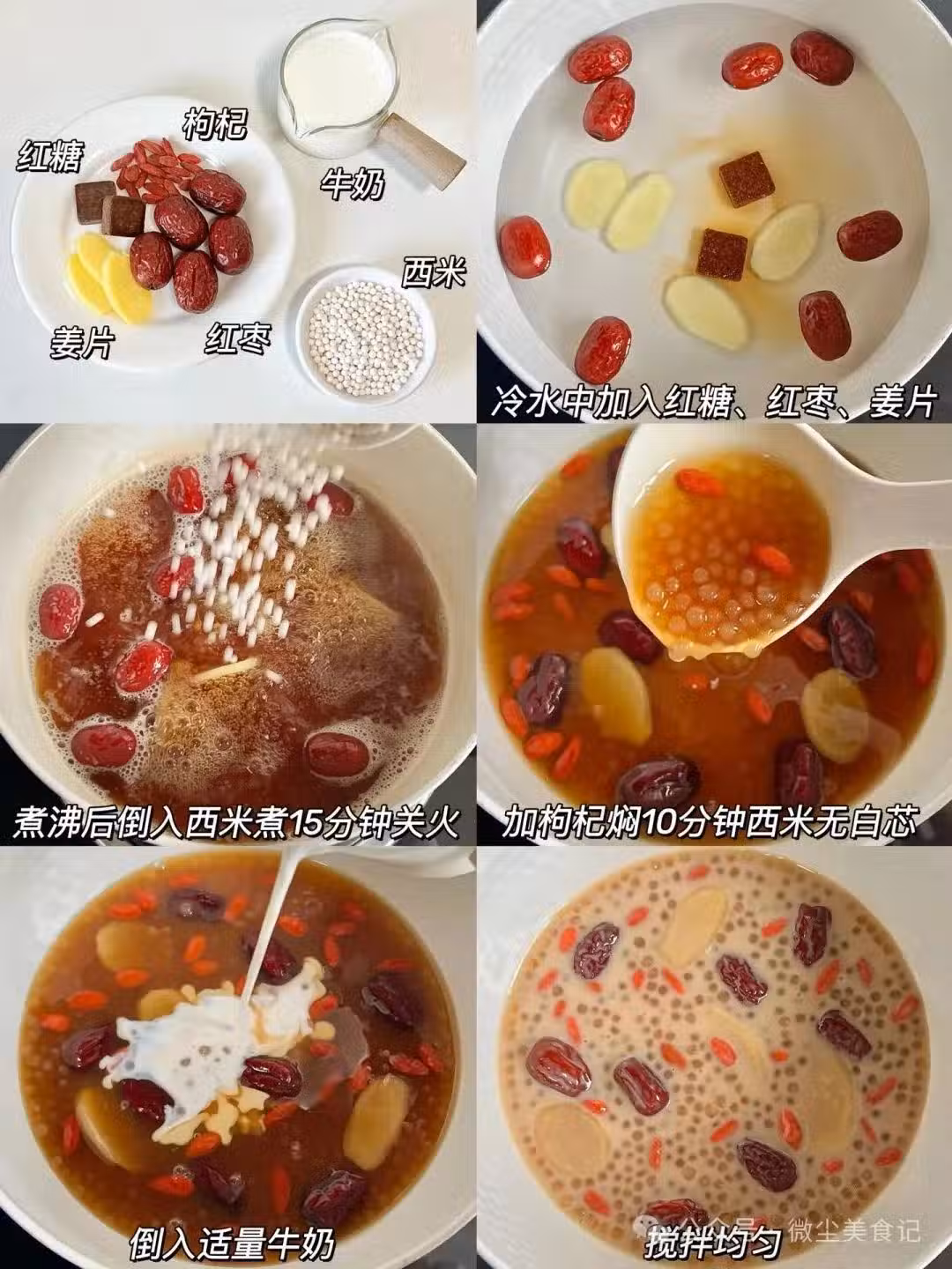【做法】冷水中加入紅糖、紅棗、薑片,煮沸後倒入西米煮15分鐘關火,加枸杞燜10分鐘至西米無白芯倒入適量牛奶,攪拌均勻