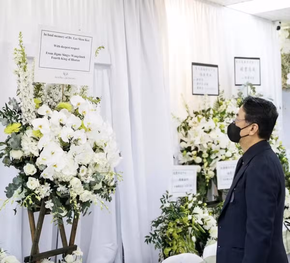 除了子女以及至親送來的花圈之外,靈堂的四周還擺放了重要人士送來的花圈,其中就有不丹國王卡薩爾旺楚克送來的花圈。恆地公開的其中一張照片,就是李家傑駐足在不丹過往送來的花圈前,凝視花圈牌的照片,牌子上面以英文寫了「懷著最深切的敬意」。