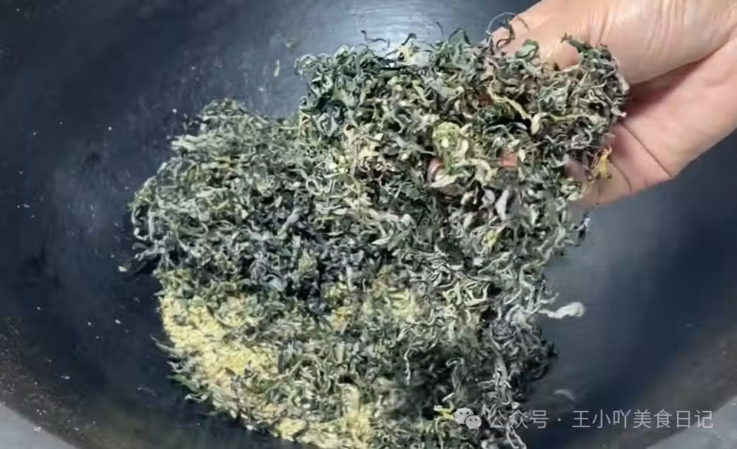 持續翻炒,直到把薑絲和艾葉中的水分完全炒干。當艾草變得乾燥、酥脆,顏色也變得深綠時,說明炒制完成了。此時的艾草、薑絲和大米已經完美融合,散發出濃郁的香氣。將炒好的艾草茶盛出,放在一旁放涼。