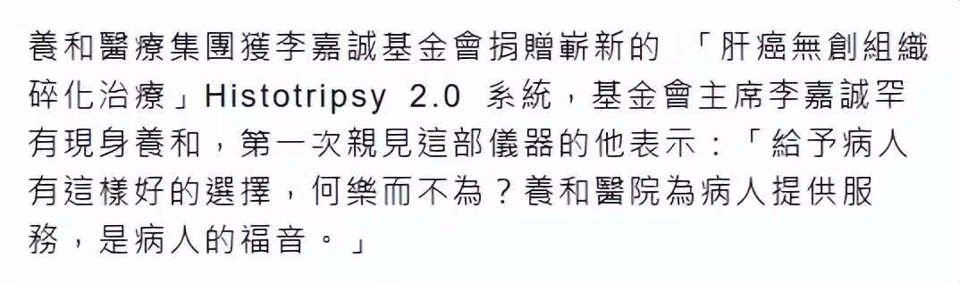 李嘉誠當天還動手做了實驗,一度成為圍觀對象,其後和院長握手,精神矍鑠。親手摸過儀器後表示「給予病人有這樣好的選擇,何樂而不為?養和醫院為病人提供服務,是病人的福音。」