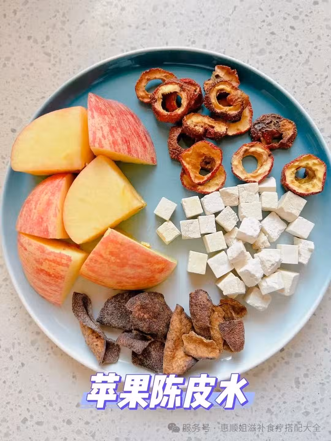 🍎蘋果半個+陳皮15g+茯苓15顆+山楂10顆,煮水10分鐘。陳皮具有調節腸胃、消食、理氣、抗過敏等功效,還能去濕化痰,一年四季都適合飲用。💃