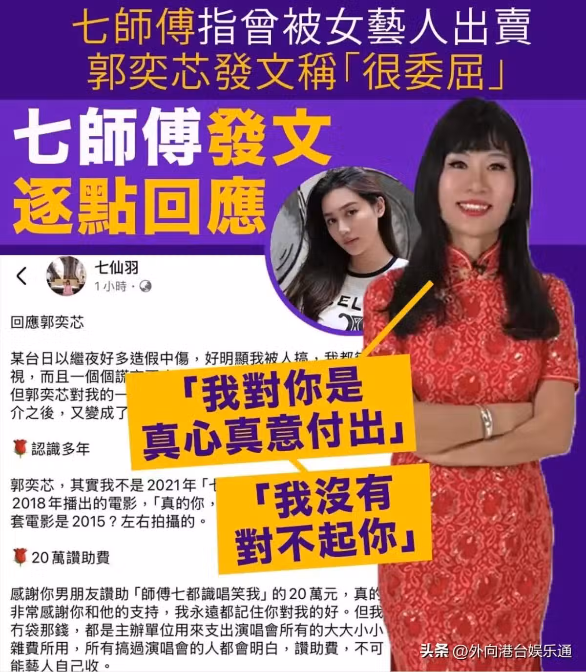 毫無疑問,近來發生的一系列事件已讓七仙羽遇到出道以來最大的危機,尤其是昔日愛徒郭奕芯的指控,更令她的處境雪上加霜。這個時候,她應該做的是拿出確鑿證據反駁,並通過法律途徑解決,而不是拿愛徒的名氣做文章,企圖藉助厭TVB情緒扭轉輿論。