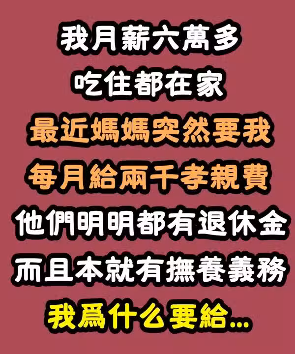 我月薪六萬多,吃住都在家,最近媽媽突然要我「每月給2千孝親費」他們明明都有退休金,而且本來就有撫養義務,我為什麼要給...