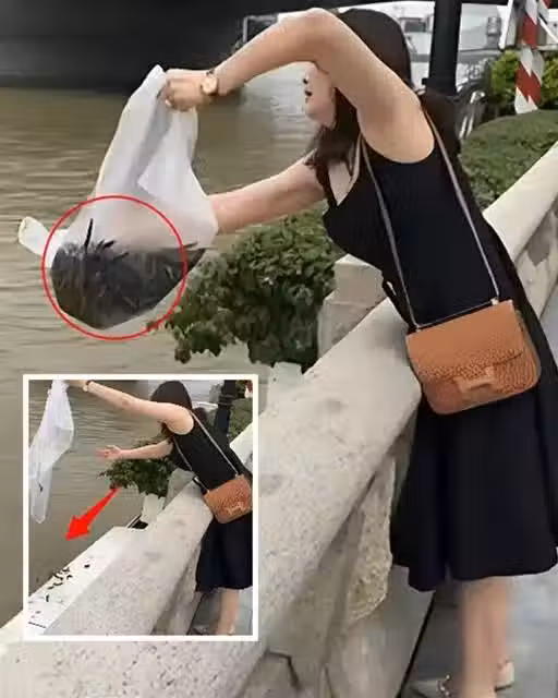 就在前不久,一名博主在河岸旁散步時無意間目睹了令人震驚的一幕——一名女子手裡提著一袋黑乎乎的東西,輕鬆地倒進了水中。
