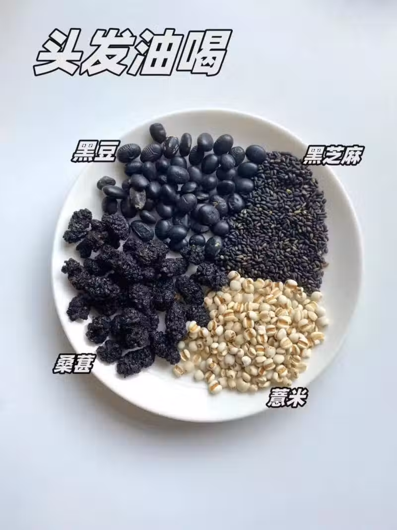 黑芝麻富含脂肪酸和膳食纖維,可調節皮脂腺分泌,減少頭皮油脂堆積,同時促進腸道蠕動,排出體內濕熱。薏米性涼味甘,具有利水滲濕功效,能排出體內多餘濕氣,緩解因濕熱導致的頭髮油膩。桑葚含有機酸和維生素,促進代謝平衡,減少油脂過度分泌,與黑芝麻協同調節頭皮環境。
