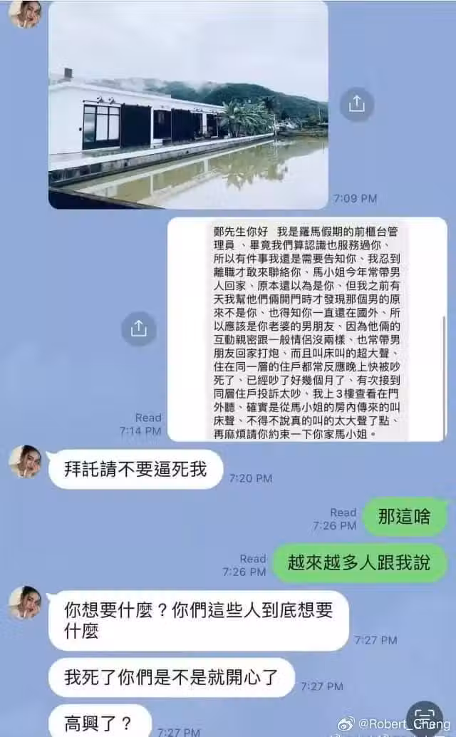 Mandy前夫Robert在微博發文,指出自己遭到恐嚇,「我已經很心力交瘁了。還要一一看這些灰心死活的證據,我想要遠離。」隨後又貼出自己當年與社區管理員的聊天紀錄,指控Mandy在婚內出軌,甚至還因叫床聲過大而屢遭鄰居投訴,讓管理員看不下去,才告訴Robert。也說這些恐嚇字眼都已經搜證,對話都是有提供給法官,也被法官認證,有判決書可以查。