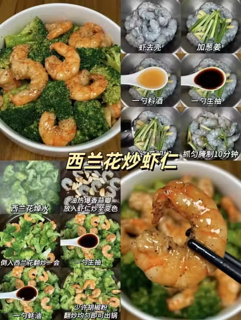6️⃣ 西蘭花炒蝦仁 清新與鮮嫩的完美搭檔。翠綠西蘭花焯水後爽脆依舊,與鮮嫩蝦仁共舞於熱鍋之中。蝦仁的 Q 彈與西蘭花的清甜相互映襯,白綠相間,視覺誘人。入口,鮮、甜、脆在舌尖交融,奏響一曲低脂又美味的健康飲食樂章。