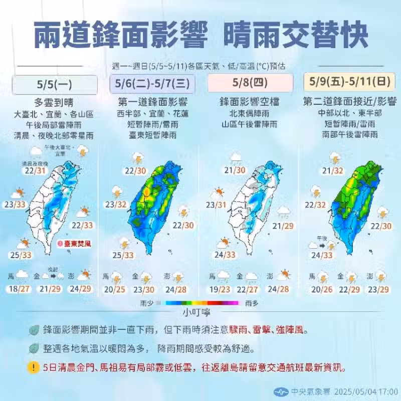 周末前天氣短暫回穩後,周五將迎來另一波鋒面接近,周六、周日全台天氣再度轉趨不穩定,中部以北及東半部地區將出現局部陣雨或雷雨,其他地區則有午後雷陣雨的機率,民眾外出需特別留意天氣變化。