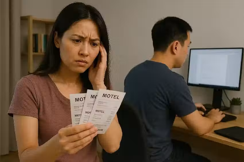 雖然這些跡象看上去都很可疑,但是女網友也沒有想太多,而是信任老公;然而有一天心血來潮整理房間,卻發現書房的電腦桌,居然有大量的發票,各種餐廳、百貨公司還有旅館的,這些看起來就是跟別人去的,讓她心碎直呼:「平時你都說我肚子那麼大,不要做家事太累了……才不會催眠自己,你是太累去休息泡澡而已,怎麼可能是自己一個人,鬼也不相信吧!」