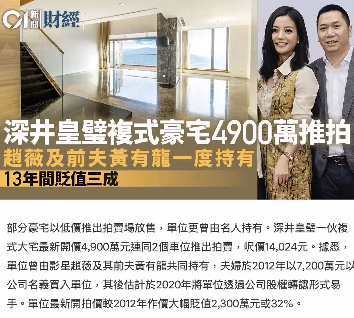 這套豪宅原本的主人是趙薇及其前夫黃有龍,夫妻倆在2012年透過「威信國際投資有限公司」的名義,以7200萬的價格買入,而對比起如今4900萬的拍賣價,這套豪宅13年間貶值了2300萬元,跌幅為32%。而趙薇與黃有龍在2020年辭任了這個公司的董事,推測這套房子也以公司股權轉讓的形式易手,至於成交價格沒有被披露。