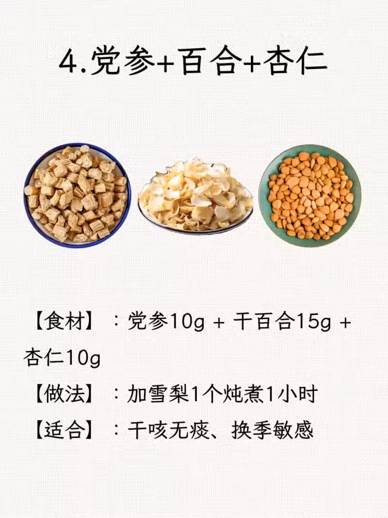 4. 黨參+百合+杏仁:潤肺止咳,適合乾燥季養生