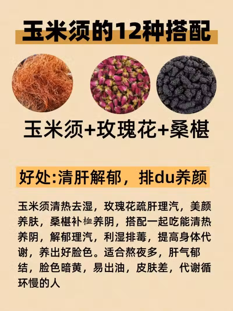 10. 玉米須+玫瑰花+桑椹:玫瑰花疏肝理氣,桑椹滋陰補血,美容養顏 。
