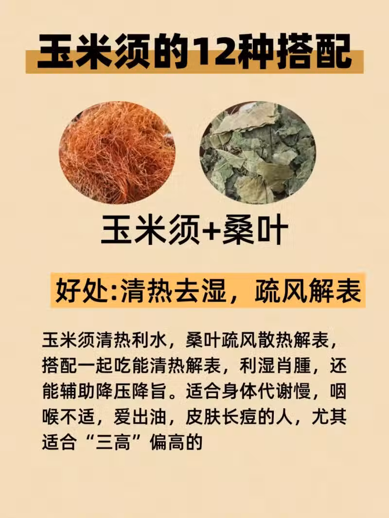 3. 玉米須+桑葉:桑葉疏散風熱,與玉米須共奏清熱明目之效 。