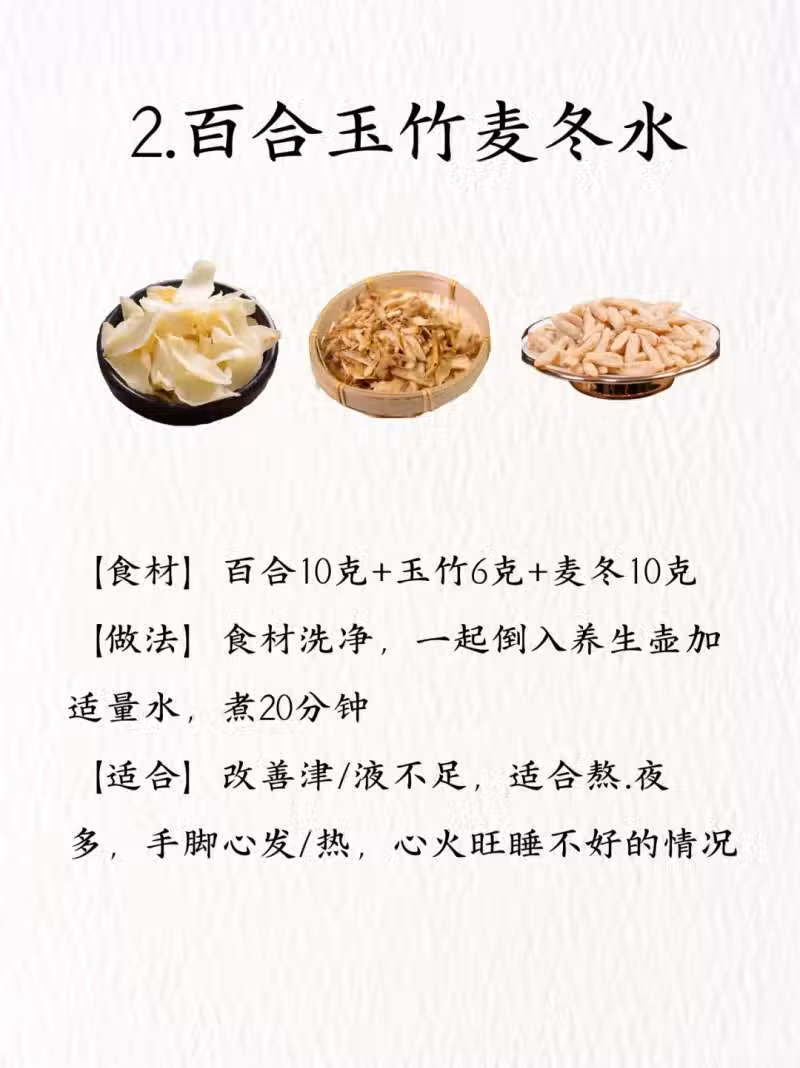 2. 百合玉竹麥冬水:能改善津液不足,適合經常熬夜、手腳心發熱、心火旺導致睡不好的人群。