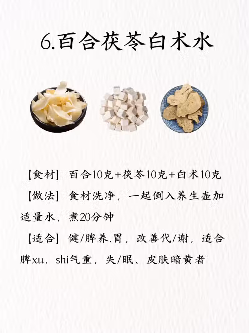 6. 百合茯苓白朮水:能健脾養胃,改善代謝,適合脾虛、濕氣重、失眠、皮膚暗黃的人群。