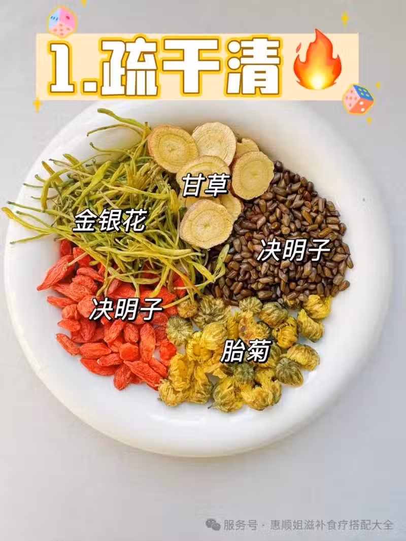 材料:甘草3克、金銀花10克、決明子10克、枸杞10克、胎菊5克