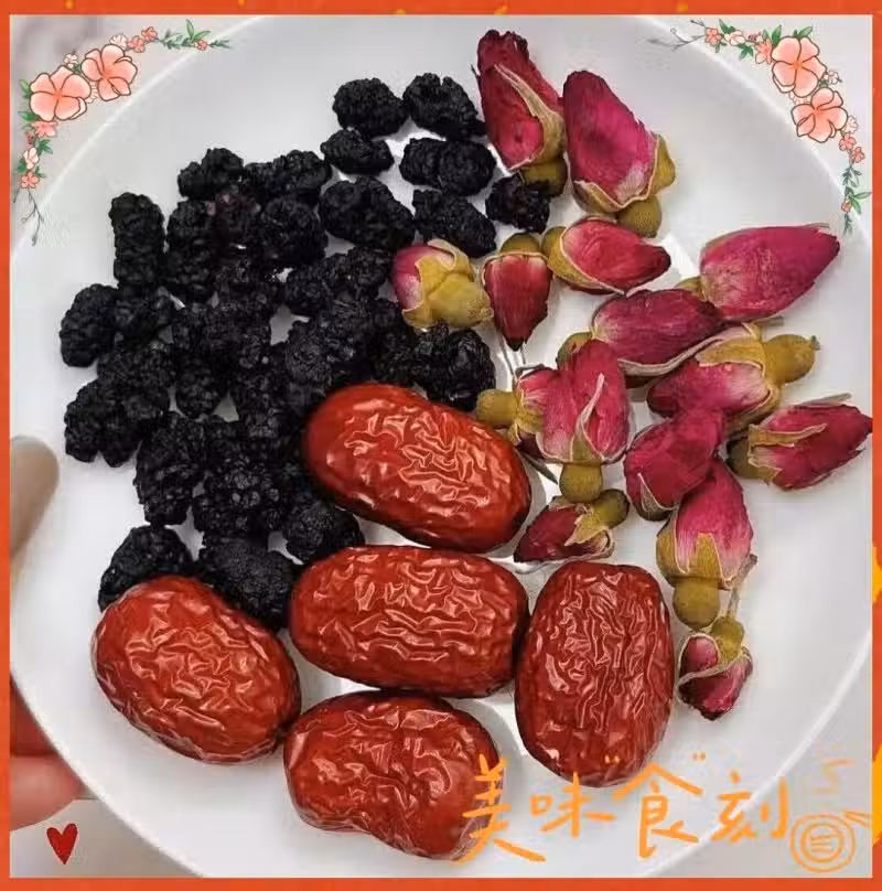 干桑葚8粒、墨紅玫瑰5朵、紅棗3顆(要去核)