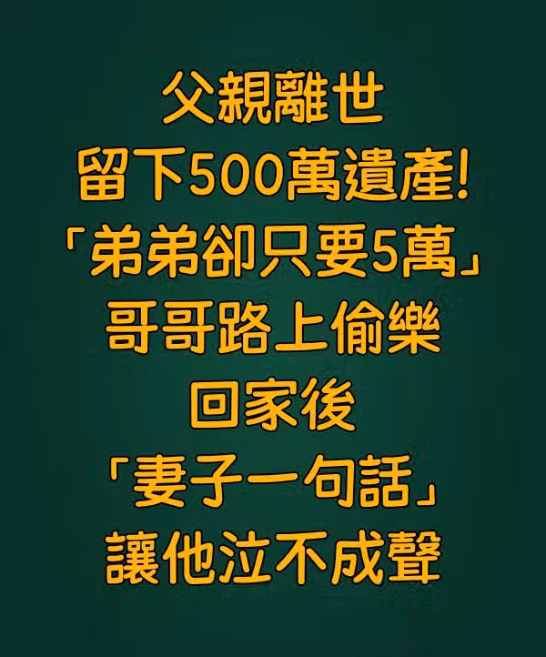 父親離世留下500萬遺產!「弟弟卻只要5萬」哥哥路上偷樂 回家後「妻子一句話」讓他泣不成聲!