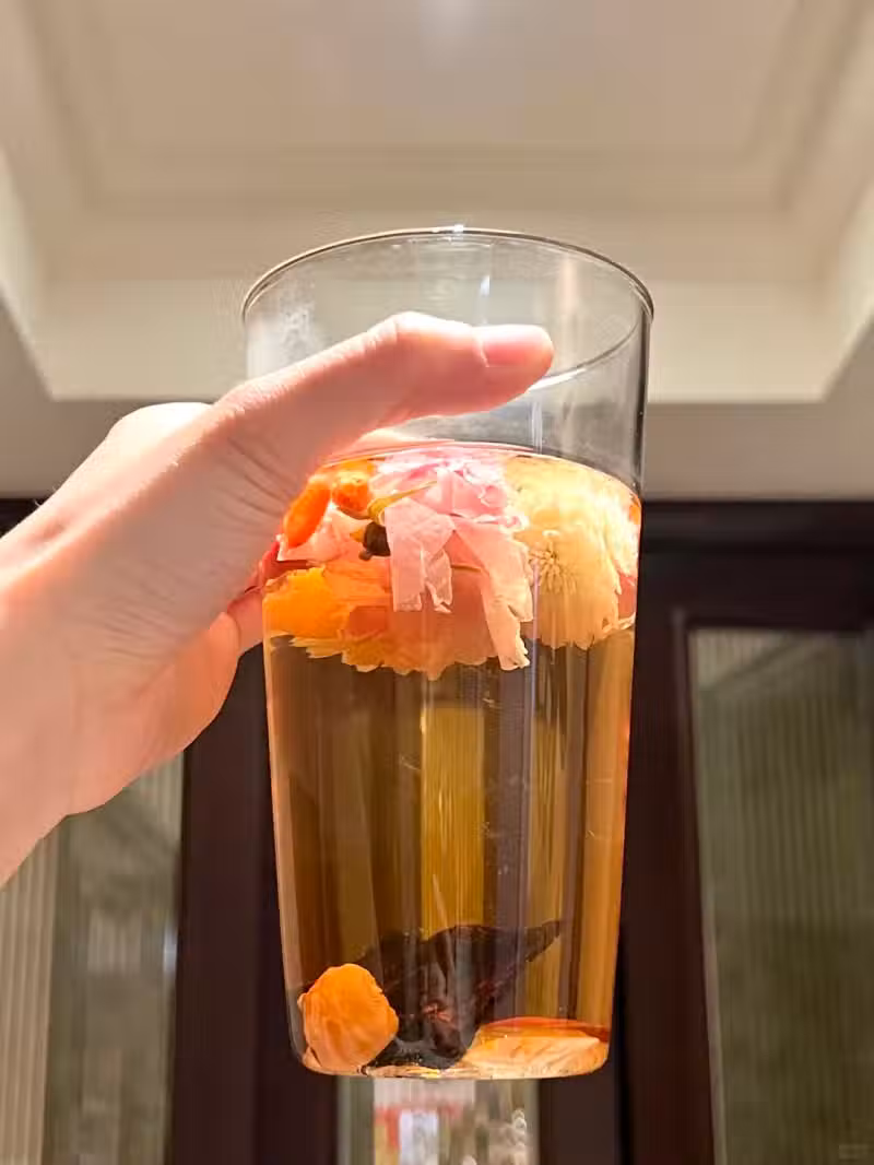 這杯元氣茶來的正合適,桂圓和枸杞都是補氣血的扛把子,玫瑰花,陳皮疏肝理氣,菊花又能中和燥熱,防止補過頭上火,搭配起來不要太完美~