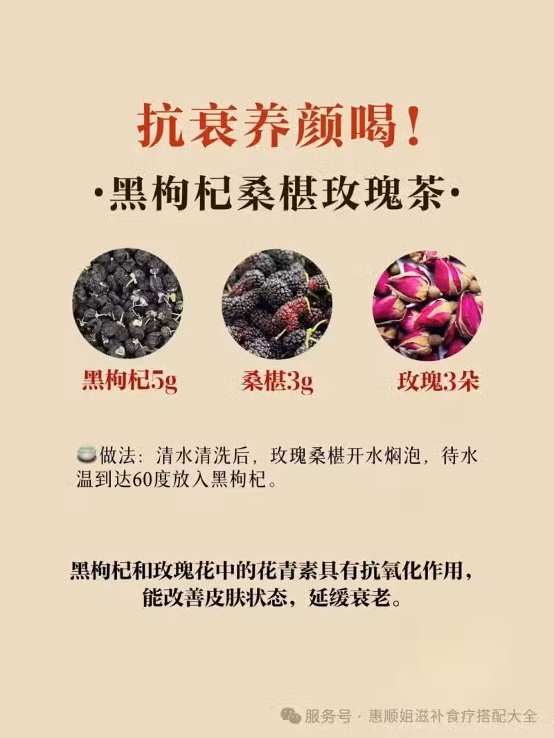 食材:黑枸杞5克、桑葚3克、玫瑰花2朵