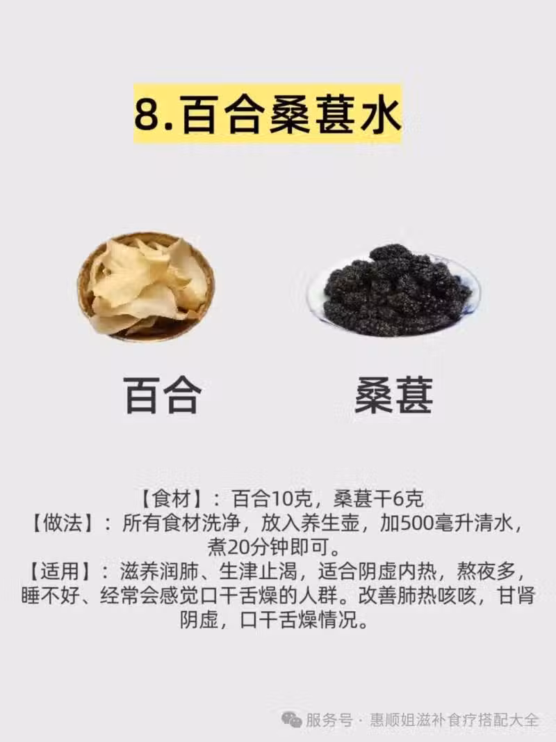 ✅️百合桑葚水:滋陰補血,改善失眠多夢。