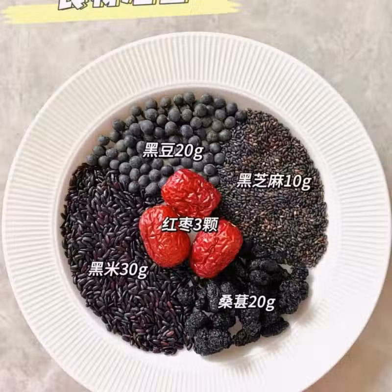 黑芝麻10g、黑豆20g、黑米30g、桑葚20g、紅棗3顆