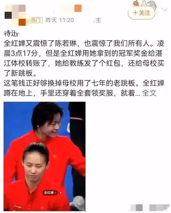 無緣冠軍一周,全紅嬋凌晨發文暴露真實現況,父親的擔心應驗了