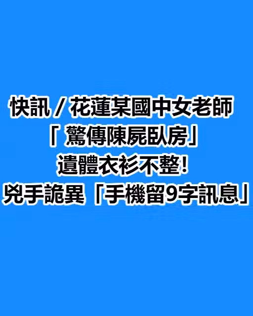 快訊/花蓮某國中女老師「驚傳陳屍臥房」遺體衣衫不整!兇手詭異「手機留9字訊息」