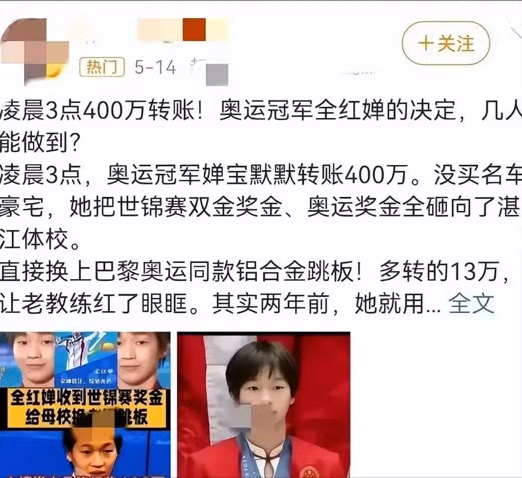 湛江體校已明確闢謠:"沒收到任何捐款,轉帳記錄和聊天截圖都是假的!"這下真相大白——這波操作更像是精心設計的"捧殺"套路。要麼捧她成"完美偶像",要麼潑髒水說她"小氣",逼得當事人兩頭為難。