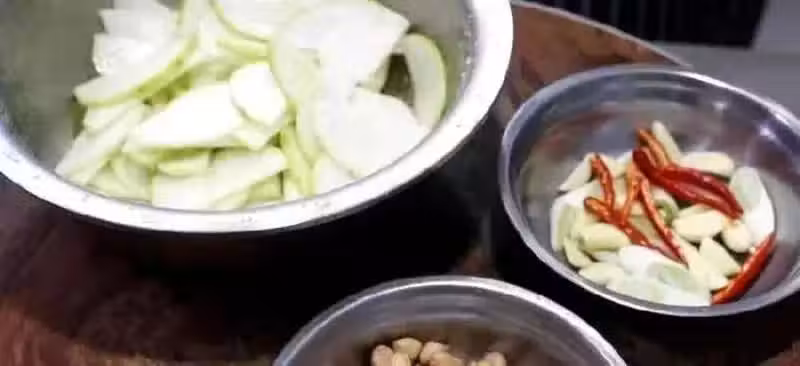 3.把蘿蔔腌好後擠干水分,放入另一個盆中備用,在裝姜蒜的小盆中, 加入味極鮮20克,生抽15克,陳醋25克,白糖20克,老抽3克上底色,用勺子攪拌化開。