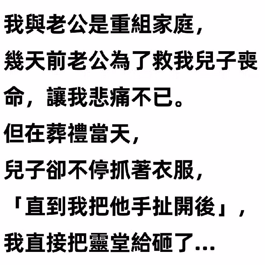 我與老公是重組家庭,幾天前老公為了救我兒子喪命, 讓我悲痛不已。但在葬禮當天,兒子卻不停抓著衣服,「直到我把他手扯開後」,我直接把靈堂給砸了…