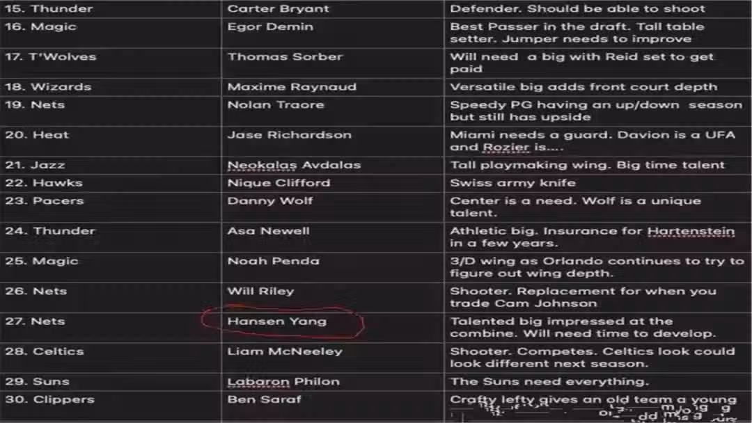 NBA選秀專家James Barlower更新了Big Board 2025模擬選秀榜單,其中來自中國球員楊瀚森在首輪27順位被籃網隊選中。Big Board 給予了楊瀚森極高的評價:「楊瀚森是一名天賦很高的大個子球員,在聯合試訓當中他的表現令人嘆為觀止,不過在未來還需要一些時間來進一步提升自己。」