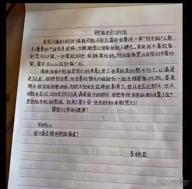 他出事的那天,叫我跟他一起去輝哥家吃飯,要是那天我沒有拒絕,就不會發生這樣的事情...2020年8月8日是滿哥離開的那天,我把所有密碼都設置了這個,也包括手機的密碼,如有下輩子,我一定會好好孝敬你們」然而,隨著第二封信的出現,簡短的兩句話:「我走了,認識你們我很開心,我真的活不下去了,所以後會無期。」更讓人覺得,女孩已經支撐不下去了,她想放棄這個世界,也放棄自己...