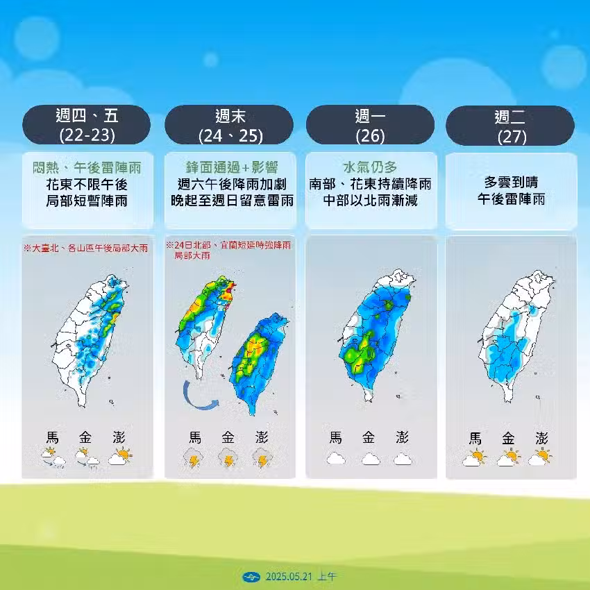 氣象專家進一步指出,下周四、五(29、30日)將迎來第4波梅雨季鋒面,加上西南風增強,預計會帶來明顯降雨。