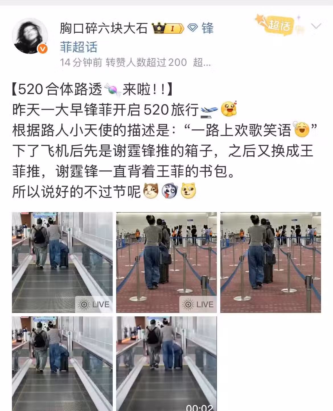 根據拍到的視頻,王菲正在推大箱子,CP粉擔心網友會以為謝霆鋒將體力活都交給了女友,所以特意解釋了一下。