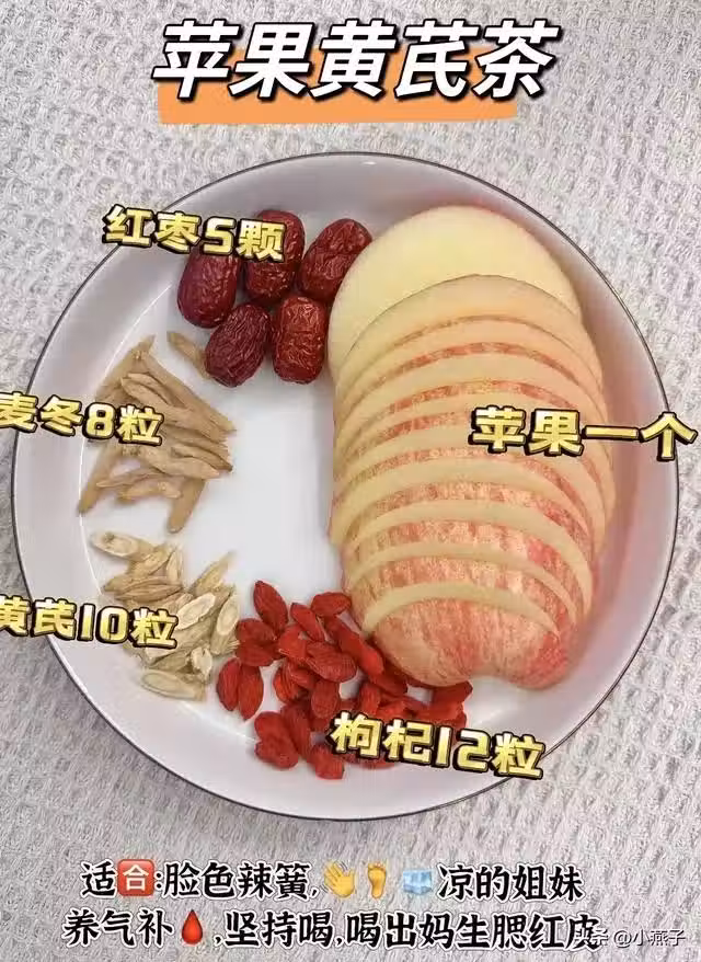 喝法:水開後煮15分鐘,黃芪的豆香+蘋果的清甜,喝完渾身暖暖的,堅持一周臉蛋自帶粉調紅暈。