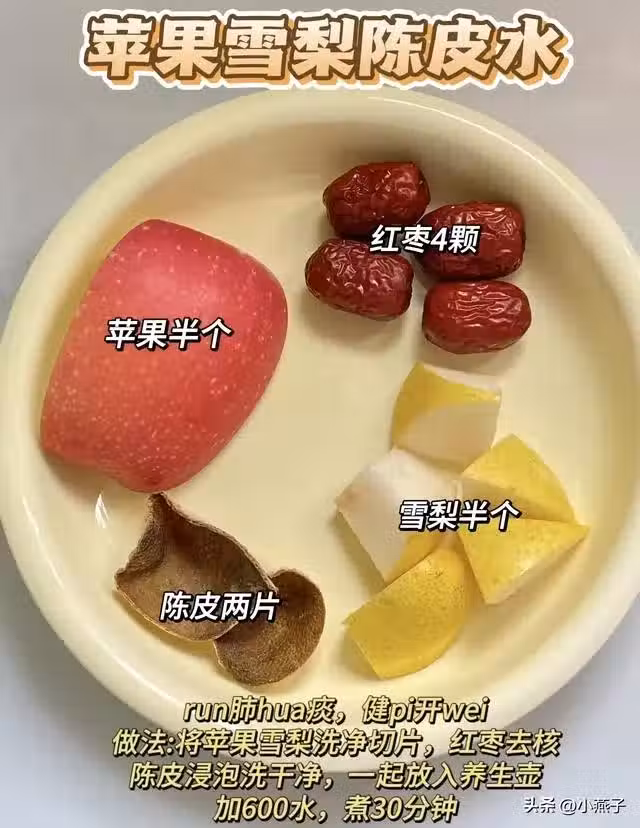做法:水果切片+陳皮泡軟+紅棗去核,煮30分鐘即可。