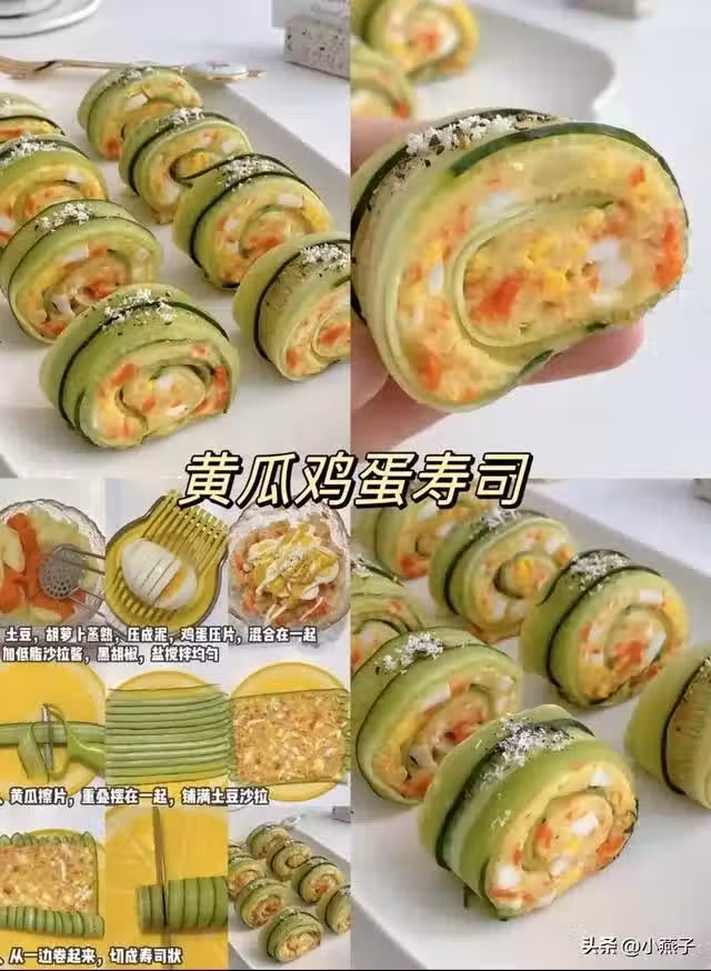 2. 黃瓜擦薄片重疊擺開,鋪一層土豆泥捲成卷,切段即可。