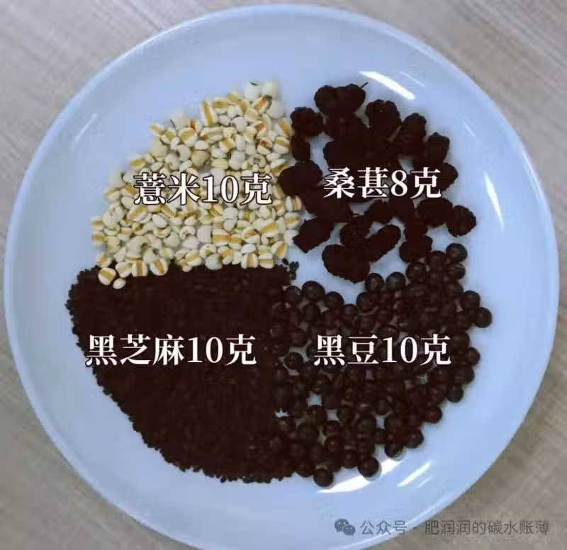 食材:薏米10克、桑葚8克、黑芝麻10克、黑豆10克