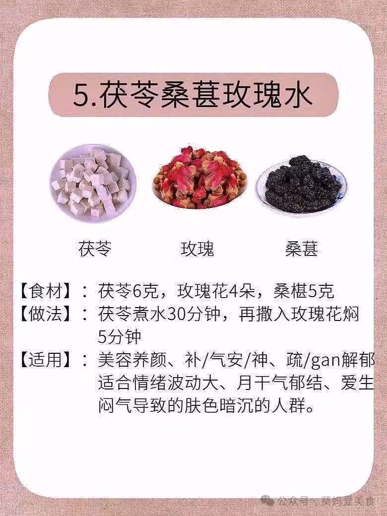 [食材] 茯苓6克,玫瑰花4朵,桑椹5克 [做法] 茯苓煮水30分鐘,再撒入玫瑰花燜5分鐘