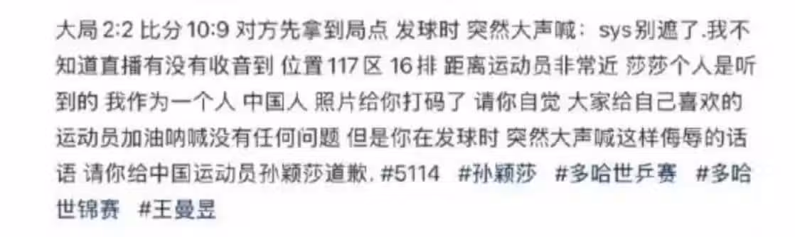 目前暫時不清楚這位極端的觀眾到底是什麼身份,但是她這樣的做法其實是非常過分的。因為大家非常的清楚,尤其在球迷在球員發球或者比賽過程當中,球迷應該嚴肅安靜,不要影響到球員的情緒。但是這位球迷不僅沒有做到,而且現在現場居然用言語去攻擊我們國家隊的運動員,嗯,換做是誰都忍受不了。所以我們才會看到其他的球迷為了維護孫穎莎和這位觀眾直接起了爭執。