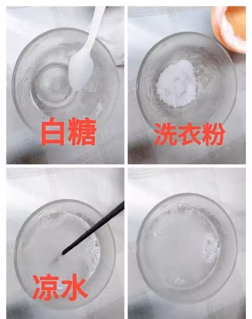 準備一個乾淨的容器,然後在裡面倒入適量白糖和洗衣粉,倒完以後再加入一些清水,將它們進行充分攪拌。