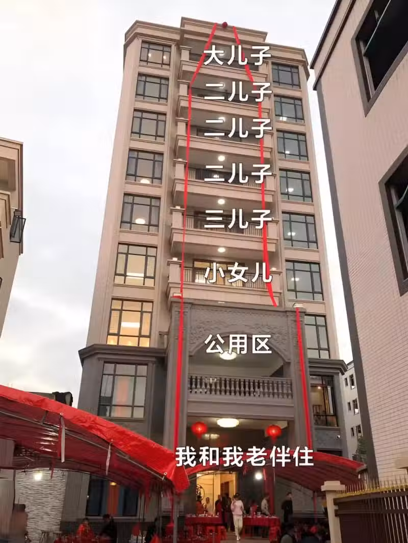 房子的規劃也考慮到了每個成員的需求,大兒子一家住在頂層,二兒子與妻子住在一層,其他子女和孫輩各自擁有自己的樓層。最底層專門為父母設計,確保他們的出行更為方便。