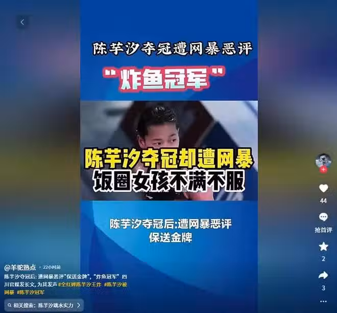 陳芋汐被惡評「保送金牌」,官媒力挺,評論區淪陷