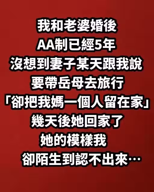 我和老婆婚後AA制已經5年,沒想到妻子某天跟我說,要帶岳母去旅行「卻把我媽一個人留在家...」,幾天後她回家了,她的模樣我卻陌生到認不出來…